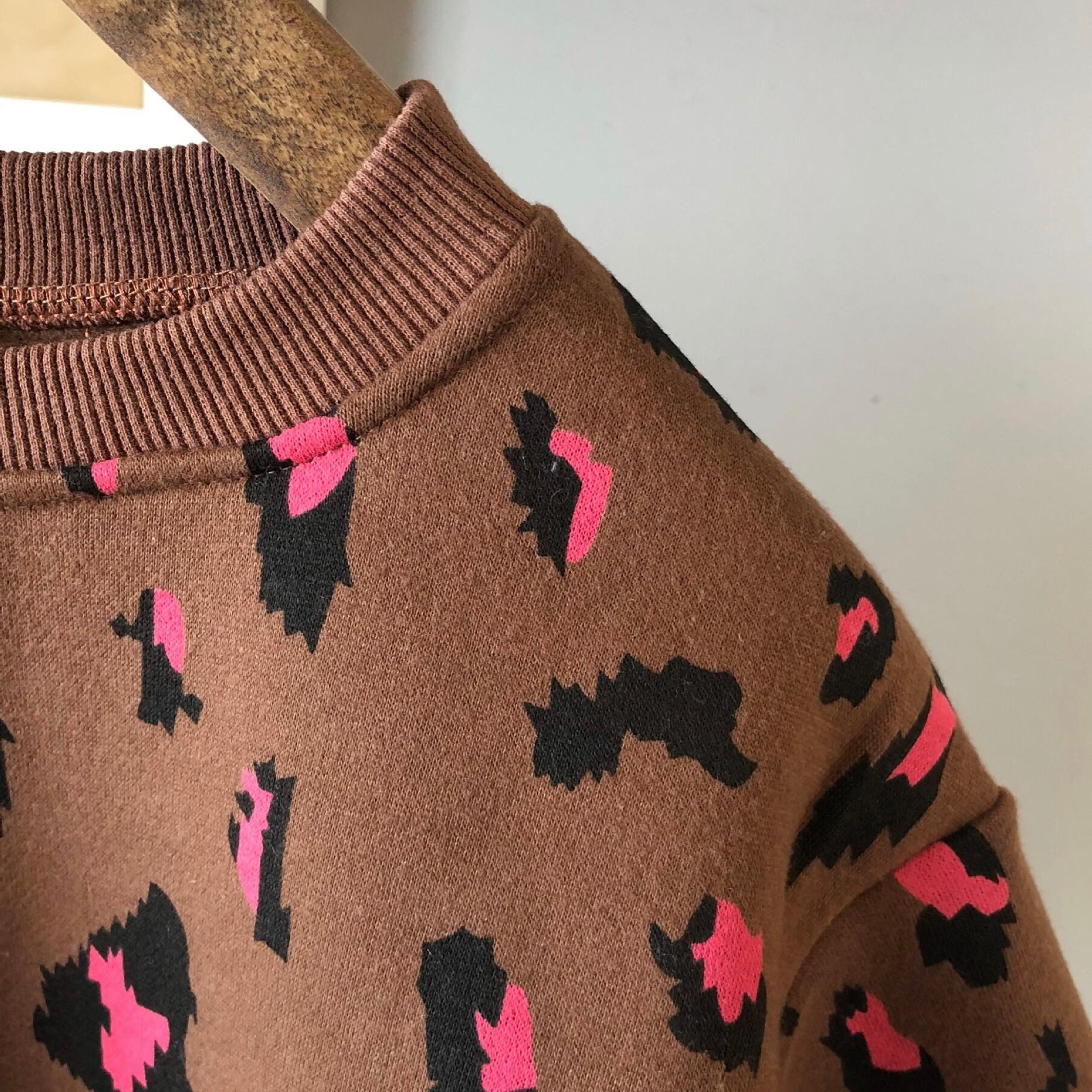 トレンドの豹柄を、お子様らしい遊び心のあるブロック調で象った厚手のトレーナー。